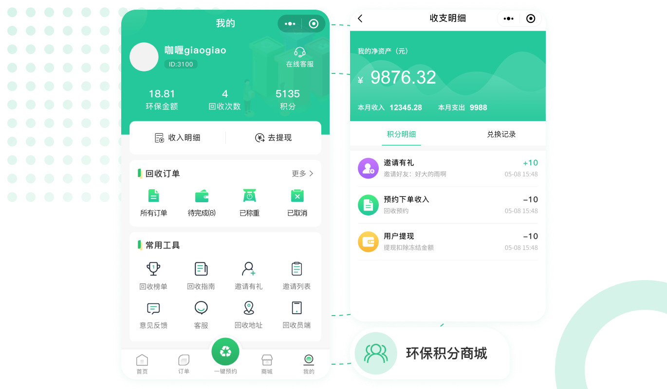 麥芒環保回收解決方案:用戶通過小程序下單、系統自動分單、回收員上門回收、線上結算打款等幫助回收行業互聯網+,實現廢品回收數互聯網轉型,為環保事業做貢獻。